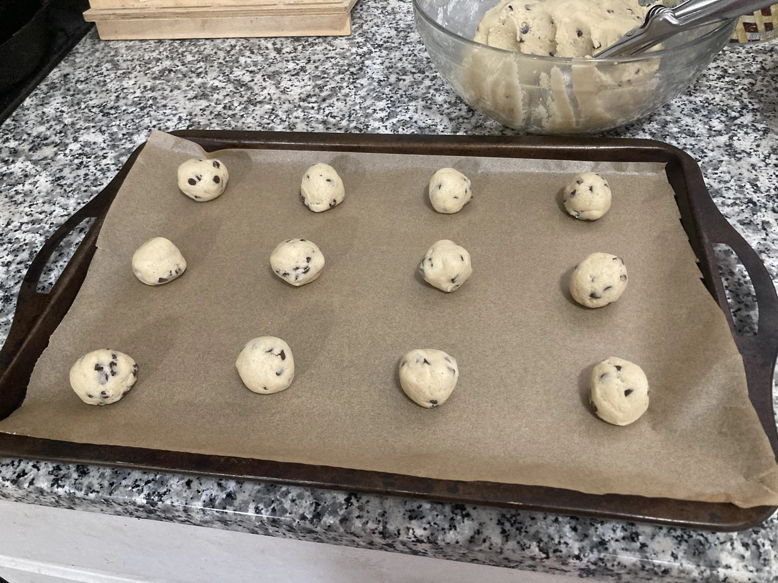 Now shape the dough into cookie dough balls (I use a cookie dough scooper) and place them on a parchment paper lined cookie sheet
